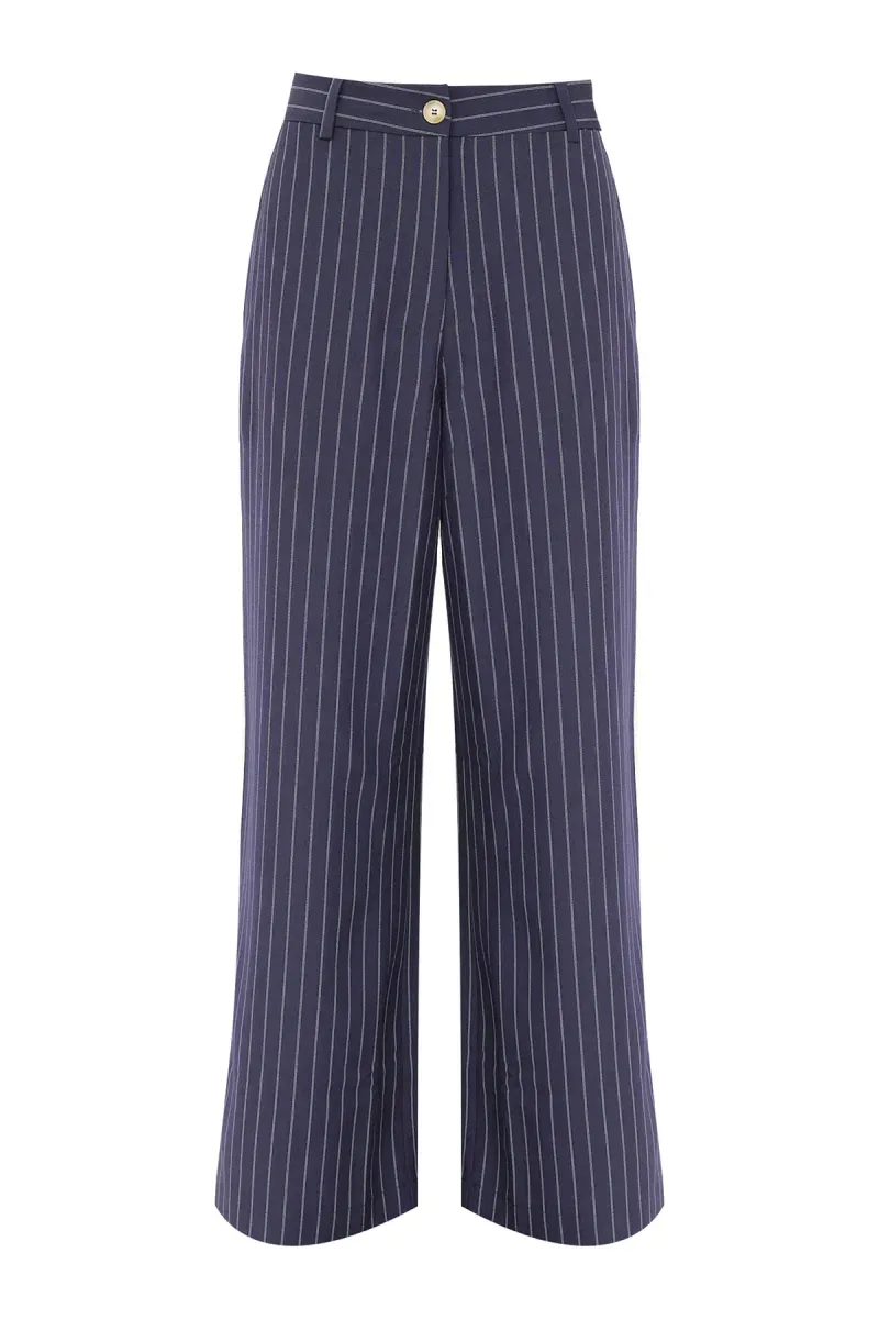 Calça de alfaiataria com toque de viscose. Modelagem reta. Cintura alta. Cós com passantes. Bolsos posteriores. Padronagem em listras verticais. Fechamento frontal em botão e zíper.