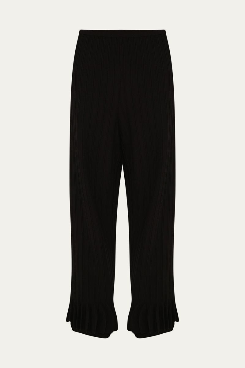 Confeccionada em malha de tricô, esta calça pantalona apresenta nervuras verticais que conferem uma textura sutil e alongam a silhueta. Com cintura alta e cós elástico, oferece um caimento elegante e confortável, complementado por uma barra diferenciada que adiciona um toque de refinamento.