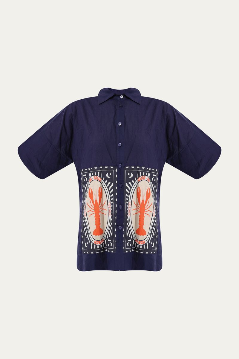 Camisa em algodão de tricoline com aplicação de bordado. Modelagem reta e shape soltinho. Gola colarinho. Mangas japonesas curtas. Sem forro embutido. Aplicação de bordados de lagostas. Barra com fendas lateras. Fechamento frontal em botões caseados.