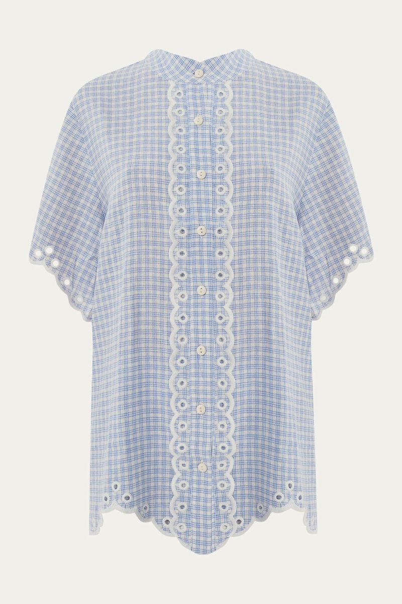 A Camisa Manga Curta Linnen Missinclof combina a leveza do linho e viscose com um design sofisticado, apresentando gola padre, mangas curtas e delicados detalhes em laise. Seu fechamento em botão caseado e padronagem xadrez oferecem um toque de elegância casual, ideal para um visual fresco e confortável.