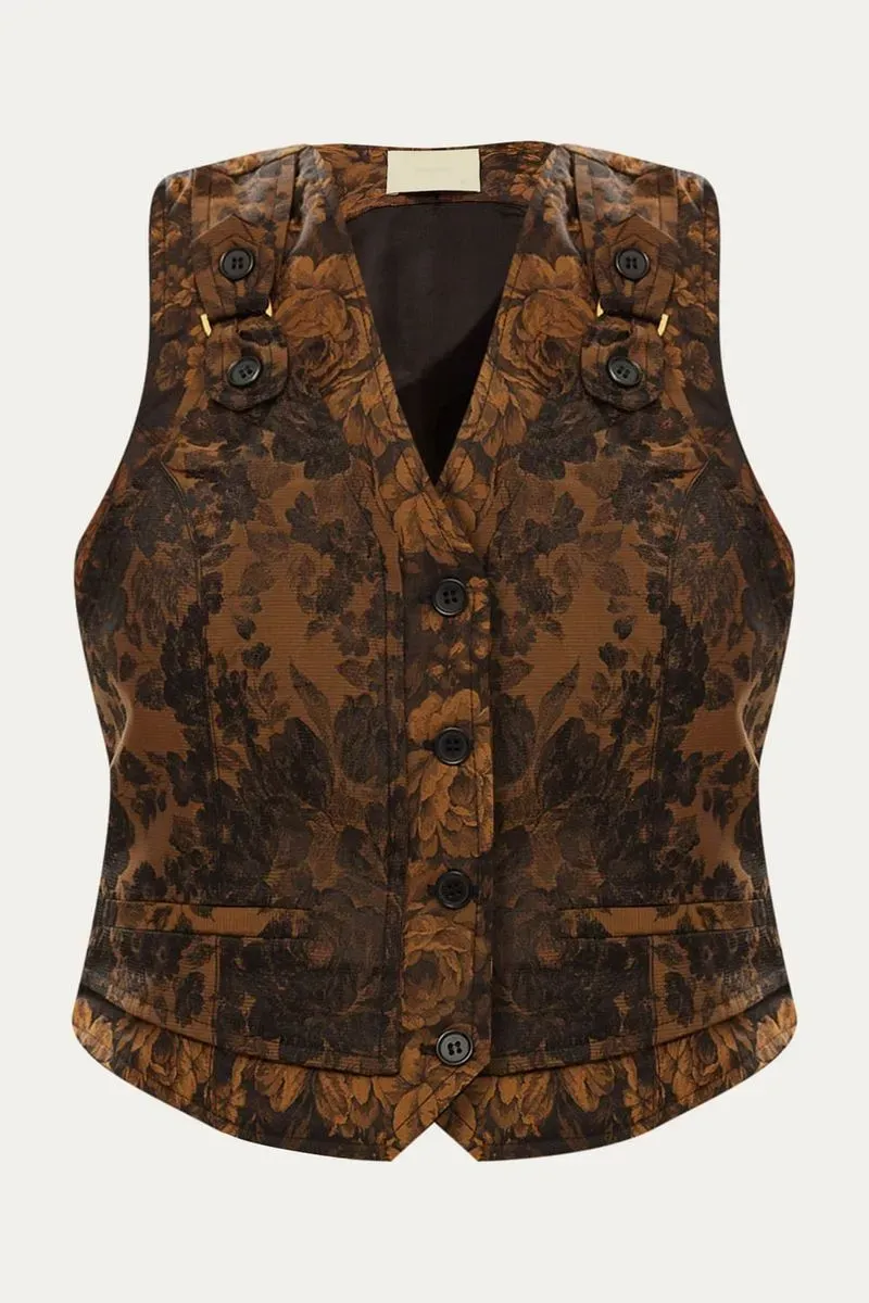 O Colete Hayden FRAMED, confeccionado através de um jacquard de rosas de singular beleza. Seus abotoamentos chineses e a camada frontal com fivelas conferem um design distintivo, sublinhando uma estética de elegância discreta. Uma escolha para quem valoriza a originalidade e o requinte no vestuário.