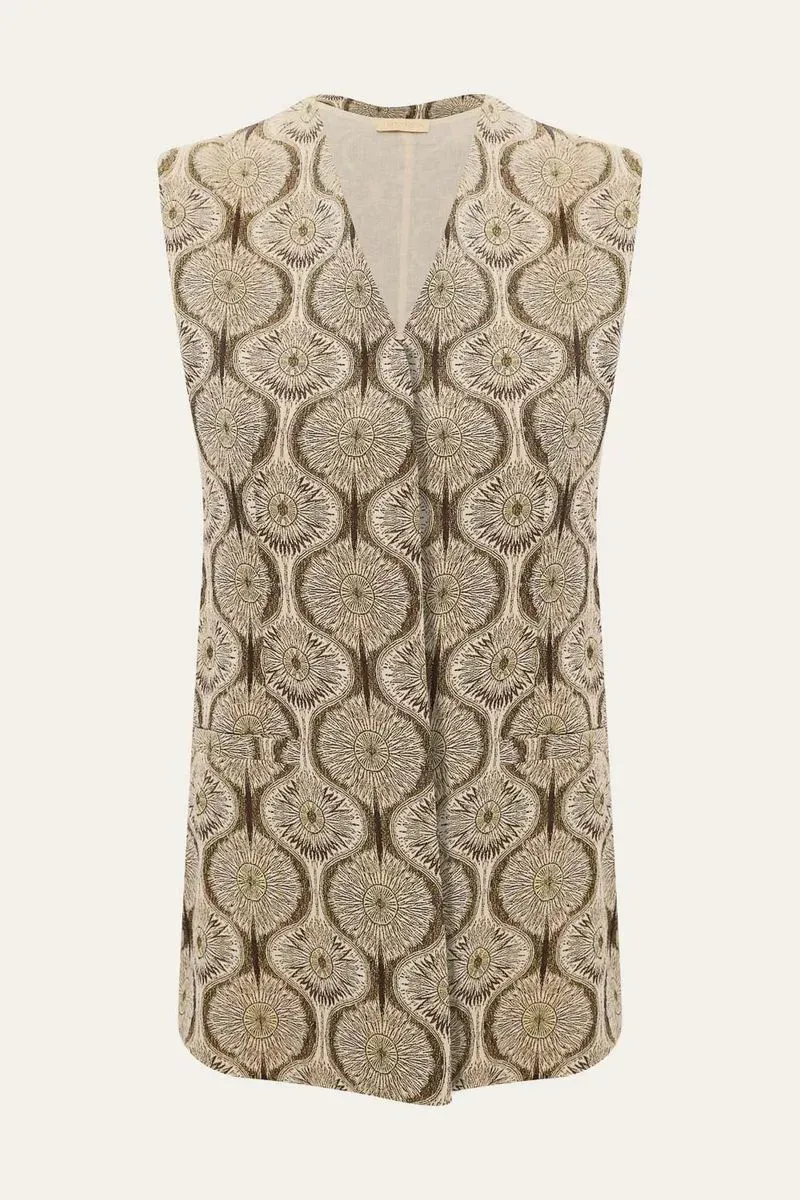 Confeccionado em um requintado jacquard, que combina a maciez do algodão com a fluidez da viscose, e adornado por uma delicada padronagem floral, o Colete Ruth apresenta um design que harmoniza sofisticação e conforto. Sua modelagem reta e elegante, com um decote em V sutil e design sem mangas, é complementada por botões discretamente embutidos e práticos bolsos frontais, oferecendo um caimento impecável.