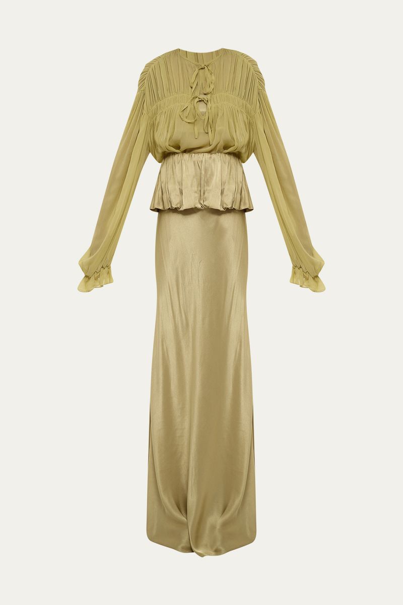 Mangas longas levemente bufantes.