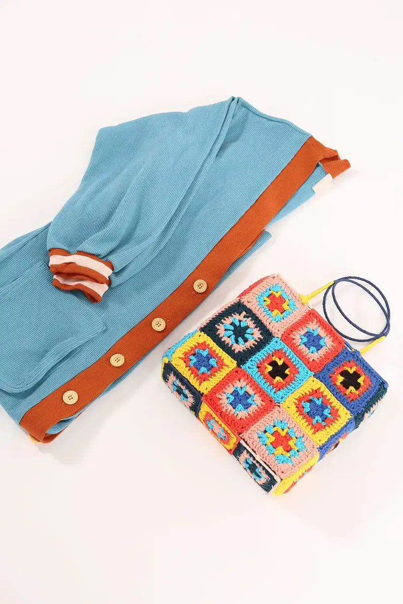 **Bolsa em crochet multicolorido. Alça fixa circular forrada. Padronagem geométrica estilizada.Forro embutido em veludo. Não possui fechamento.