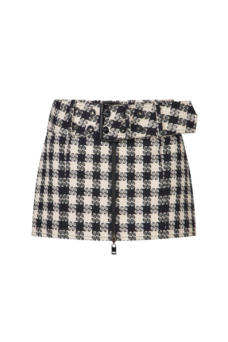 A Mini Saia Jacquard Champion Iris em preto e branco é uma peça sofisticada, confeccionada com uma rica composição de algodão e poliéster, apresentando um elegante padrão geométrico. Seu design mini e o fechamento em zíper frontal conferem um toque moderno e versátil, ideal para quem busca estilo e conforto.
