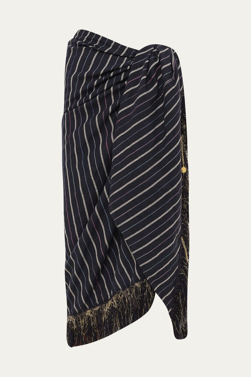 O Pareô Louise é uma peça versátil confeccionada em tecido listrado, combinando poliéster, algodão e rayon. Sua barra é adornada com aplicação de franjas e medalinhas, permitindo diversas formas de uso e adicionando um toque de estilo único.