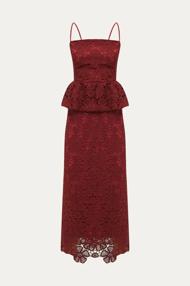 O Vestido Alça Rosa Blanca em vinho é uma peça deslumbrante, confeccionada em delicada renda de algodão com padronagem floral. Sua modelagem midi, com alças e um charmoso peplum na linha da cintura, oferece um caimento elegante e sofisticado, ideal para quem busca estilo e conforto.