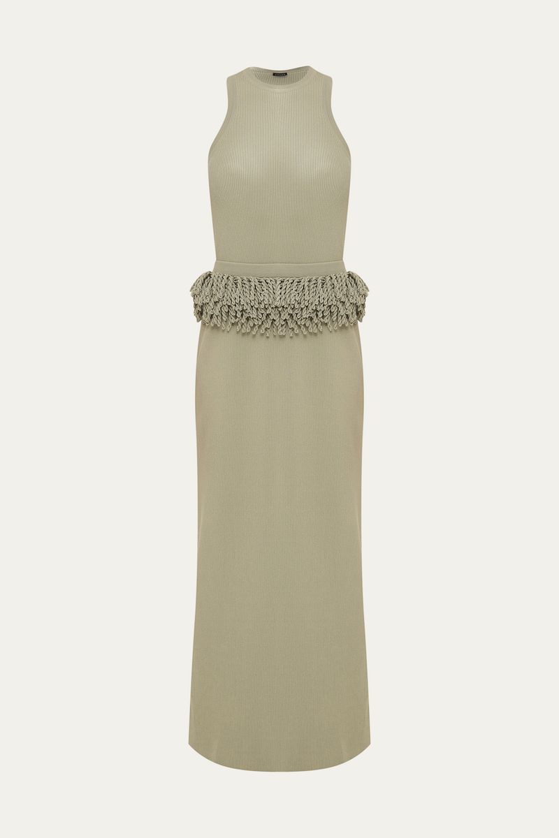 O Vestido Longo Tricô, na serena tonalidade verde, revela-se como uma peça de notável sofisticação. Confeccionado em malha de tricô de caimento impecável, este modelo de silhueta reta apresenta um decote redondo e design sem mangas. Acompanha um cinto no mesmo tecido, que delicadamente define a cintura, e é adornado por charmosos detalhes de franjas, conferindo um movimento sutil e um toque contemporâneo.