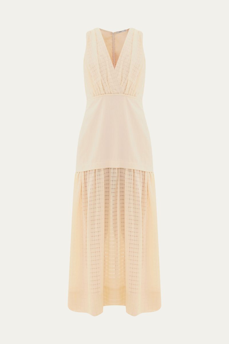O Vestido Midi Lajour Clemence, confeccionado em algodão maquinetado, apresenta um design sofisticado sem mangas, busto drapeado e decote profundo. Seu shape ajustado ao corpo e a saia franzida com barrado largo proporcionam um caimento elegante e confortável, ideal para realçar a silhueta com um toque de leveza.