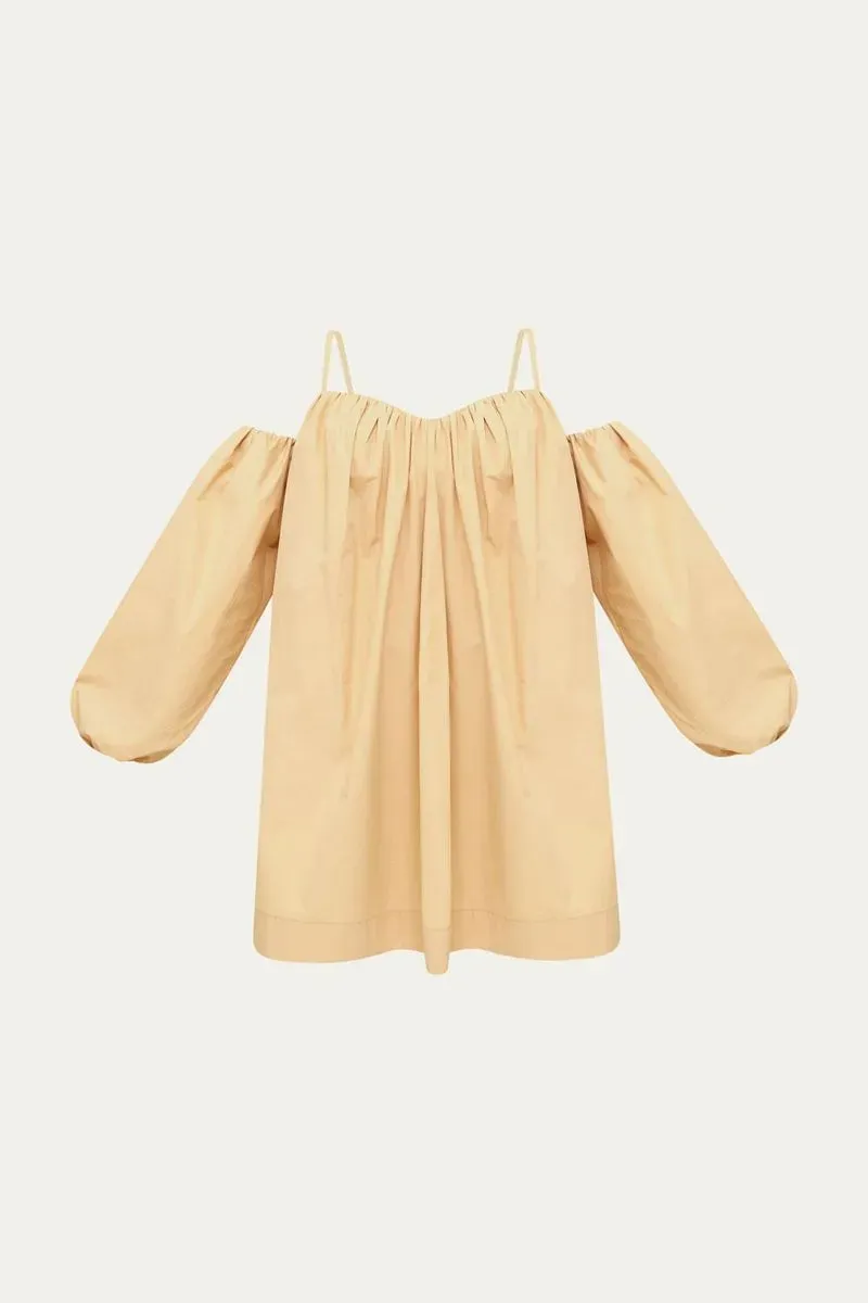O Vestido Mini Fabrille, confeccionado em algodão, apresenta um design distintivo com alças finas, decote coração e mangas volumosas aplicadas lateralmente, criando uma silhueta moderna e elegante. Esta peça única oferece conforto e um toque de sofisticação para diversas ocasiões.