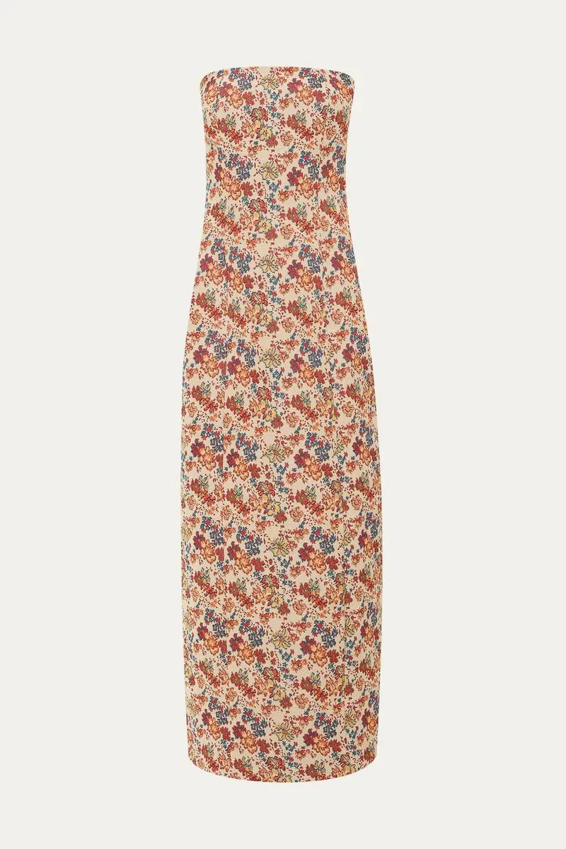 O Vestido Miranda apresenta um design floral sofisticado em tecido de tapeçaria, destacando-se pela modelagem reta, comprimento longo e um elegante decote sem alças. Com uma fenda discreta no centro costas e forro contrastante, esta peça única oferece um toque de estilo e feminilidade para diversas ocasiões.