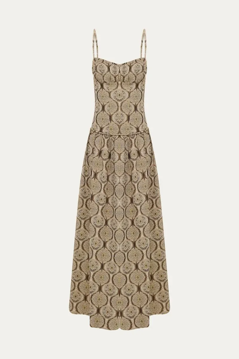 Confeccionado em jacquard de algodão com padronagem floral, o Vestido Ruth é uma peça que exala delicadeza e sofisticação. Sua modelagem evasê, complementada por um decote coração e alças finas, desenha uma silhueta graciosa. A linha de cintura baixa, acentuada pelo detalhe em vivo, culmina em uma saia franzida de comprimento longo, que confere um caimento fluido e elegante. O fechamento posterior por zíper invisível assegura um acabamento impecável.